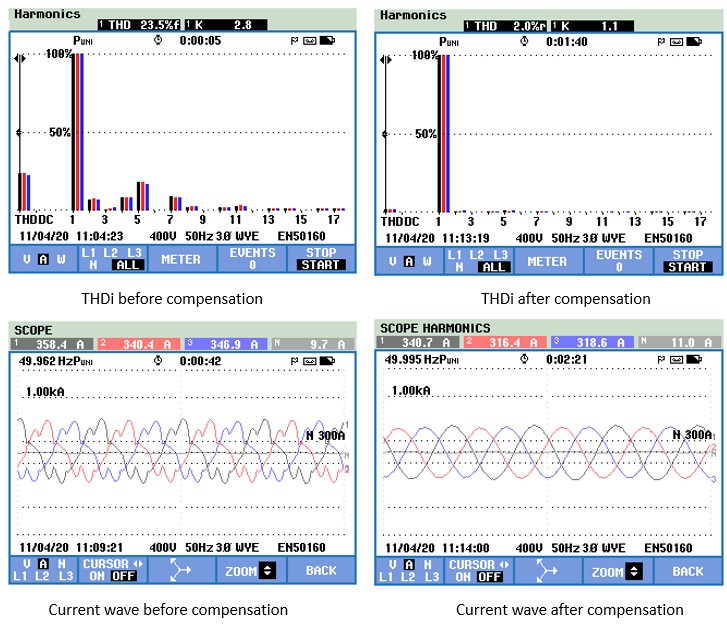 To resolve these issues, the facility installed a 300A Active Power Filter (APF) cabinet. The APF works by monitoring the load current in real-time. It then injects an equal and opposite compensation current. This process cancels out the harmonics effectively and cleans the grid.